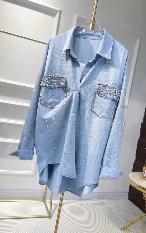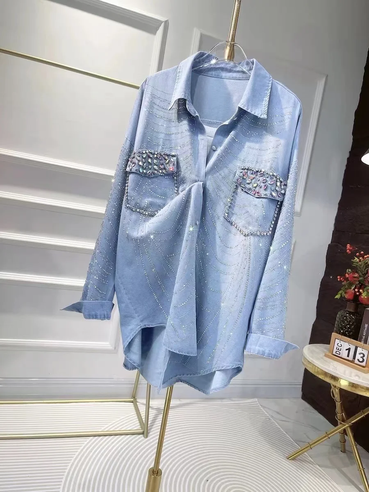Nuovo 2025 primavera autunno tendenza alla moda a caldo foratura camicie in Denim camicette per donna ampia Casual Jeans top donna
