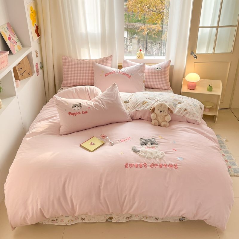 Nuovo Set di Biancheria da Letto in Cotone Lavato di Grado A con Ricamo Applicato, Copripiumino e Lenzuola Delicati sulla Pelle per Casa e Dormitori