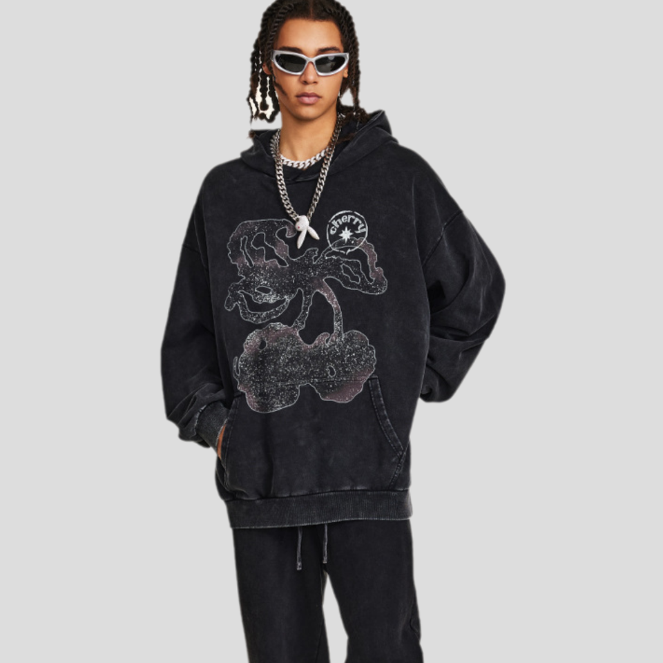 New American Trend 380G Vintage Fruit Print Pullover Hoodie for Men Gradient Color Contrast 100% Cotton for Spring