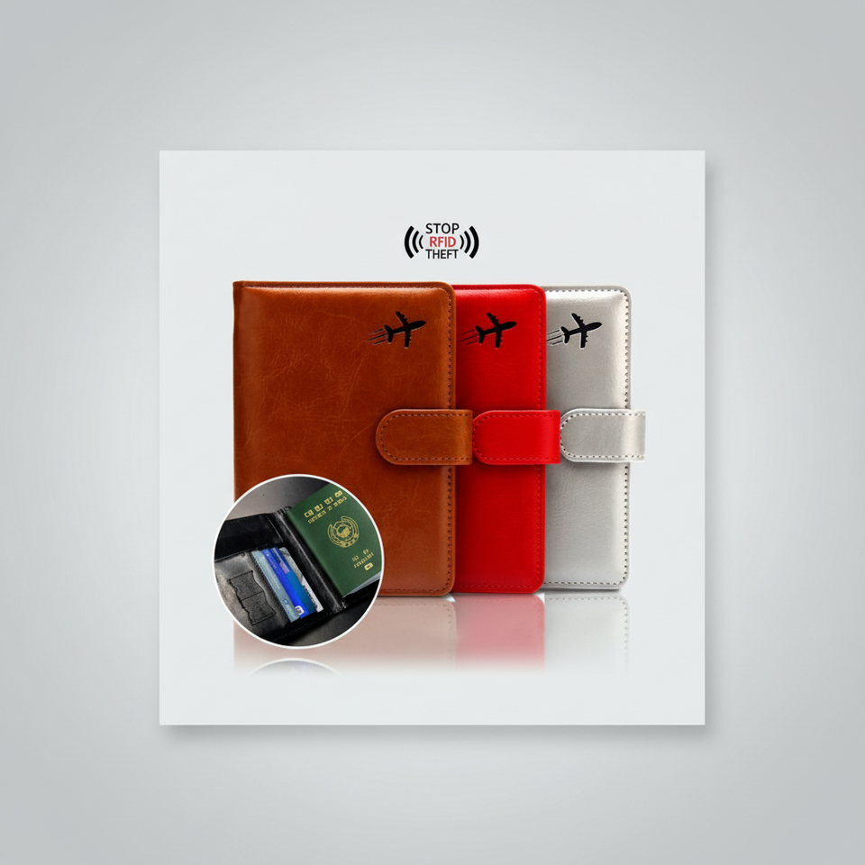 New Anti-Skimming Magnetic Buckle Leather Passport Wallet with Ticket Card Storage and Sim Card Pocket