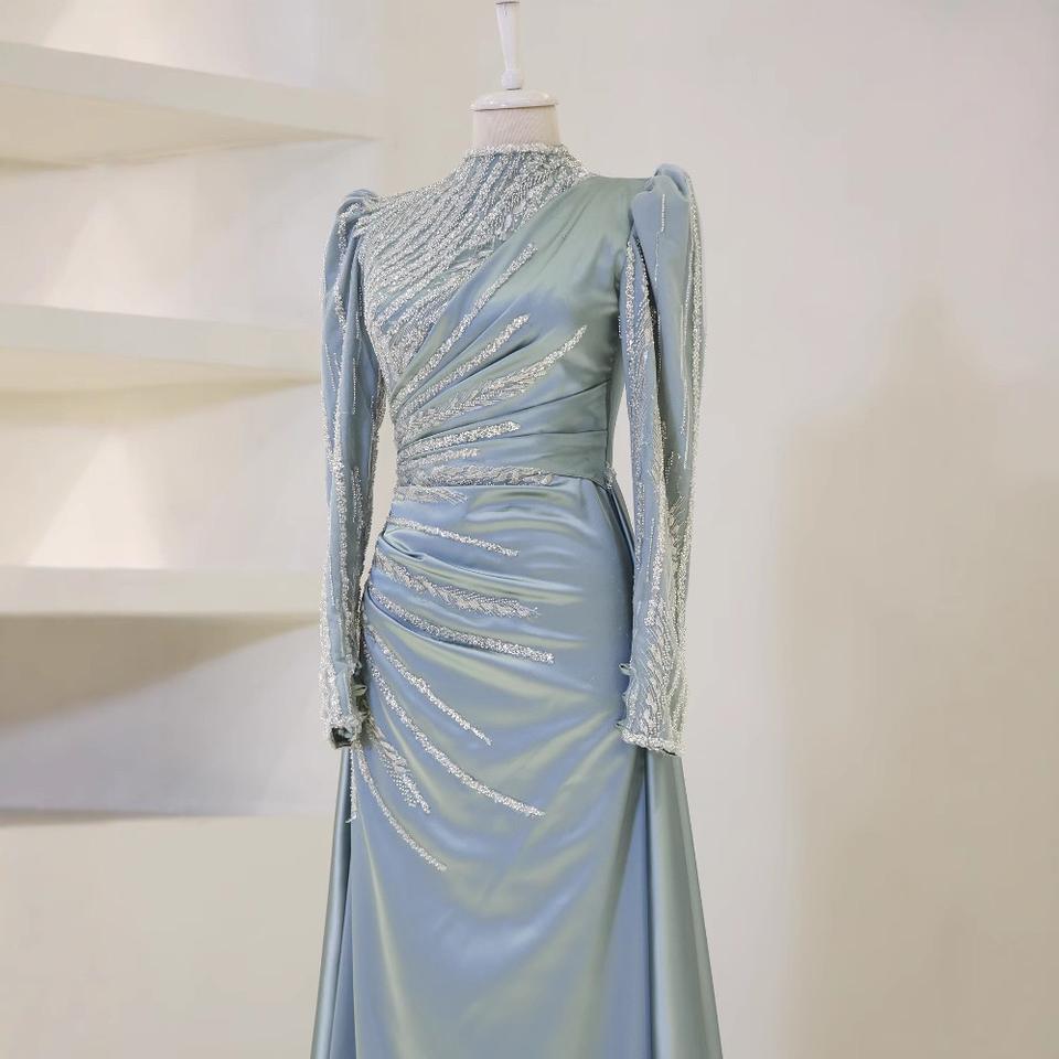 New Arrival Elegant Evening Dress Sequins Ruffle Design Bubble Sleeves Gauze Arab Abayas Muslim Women Party Dress