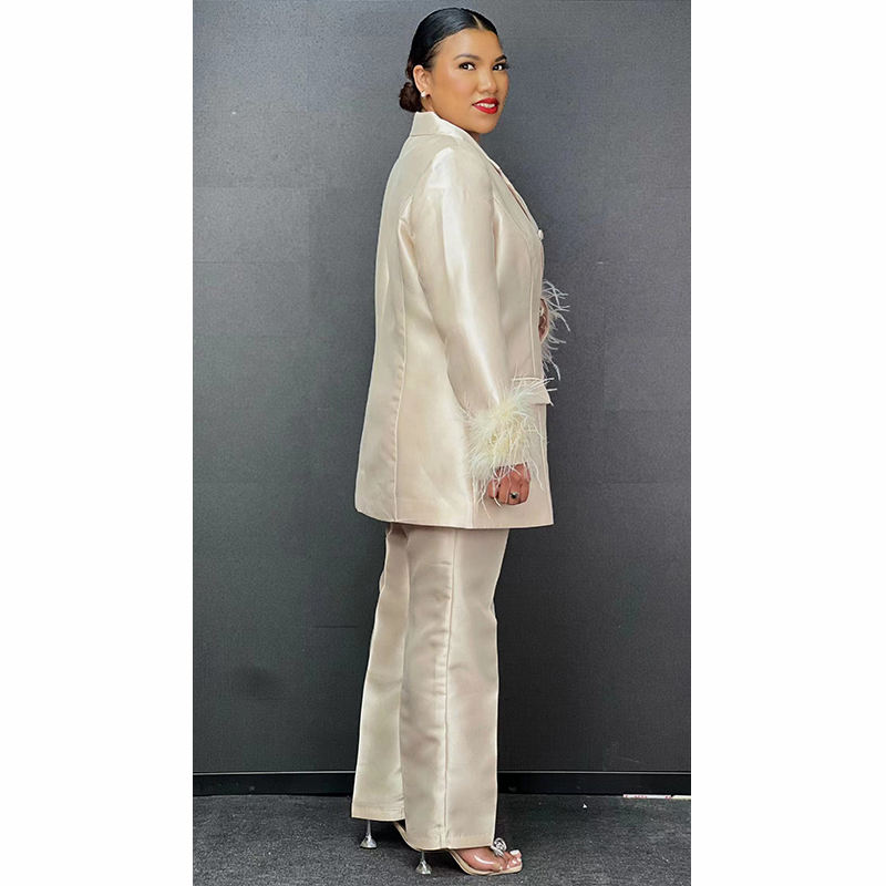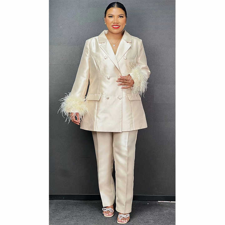 Nuovi Arrivi: Set Elegante da Donna a Due Pezzi con Pantaloni Dritti, Completo da Ufficio Taglie Forti con Dettagli in Piume