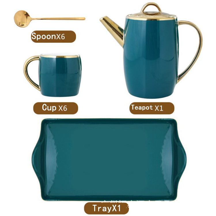 Nuovo arrivo set da tè in ceramica oro verde 8 pezzi con vassoio sei tazze in porcellana piattino teiera per regali per caffè
