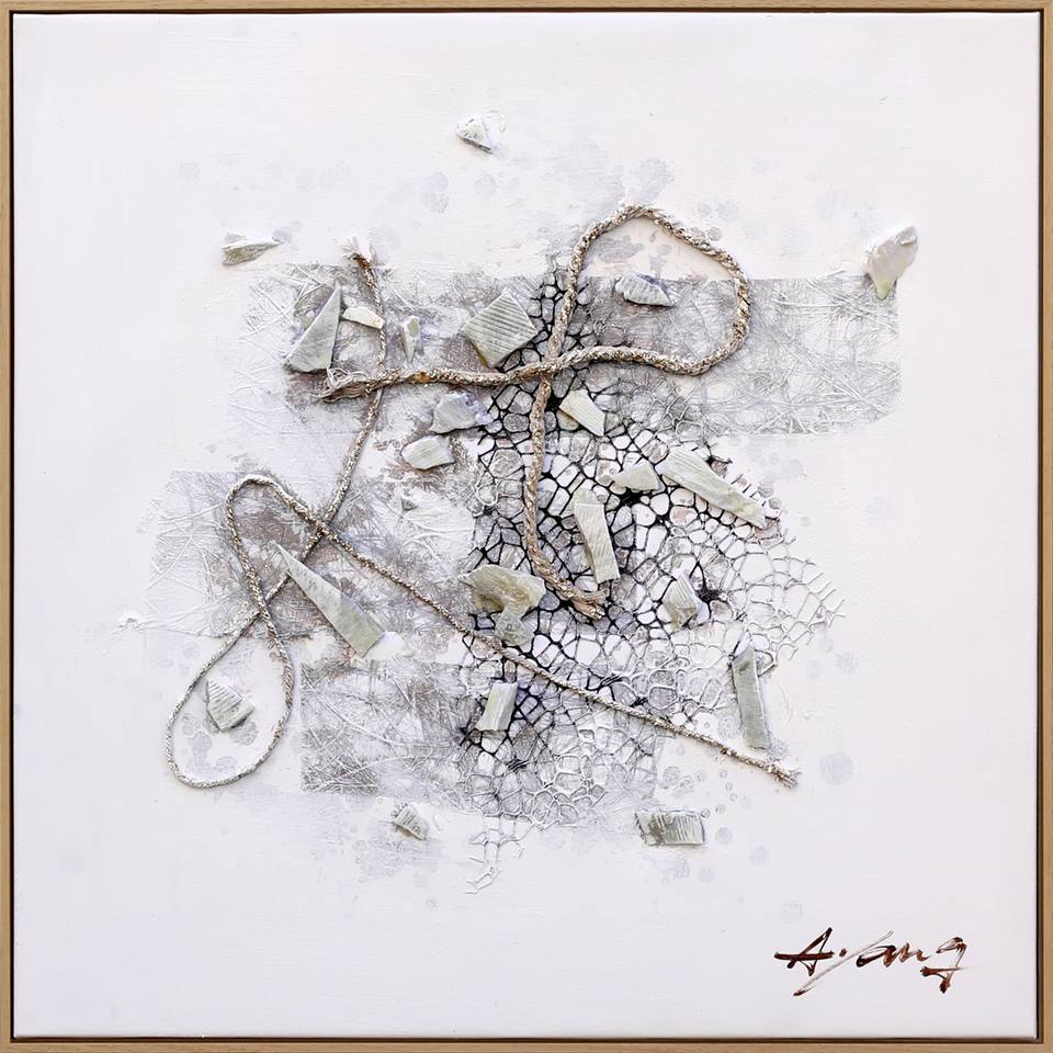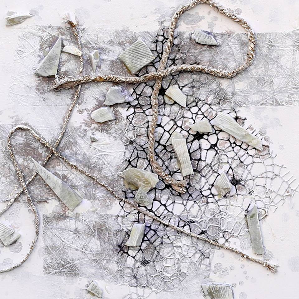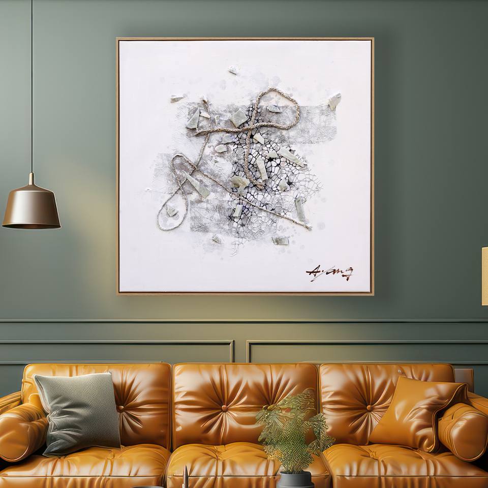 Nuovo Arrivo: Quadro su Tela Dipinto a Mano con Tecnica Mista, Natura Morta, Corda di Canapa e Pietra Naturale