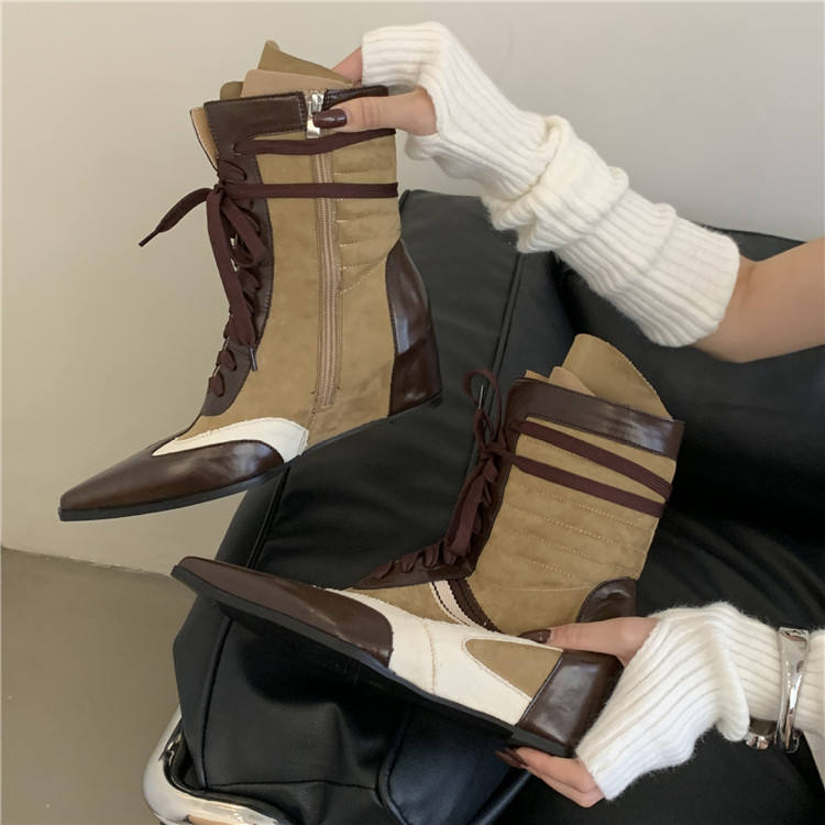 New Arrival Lace-Up Sports Style Boxing Boots Pointed Toe Martin Boots Wedge Heel Retro Color-Block Boots for Women
