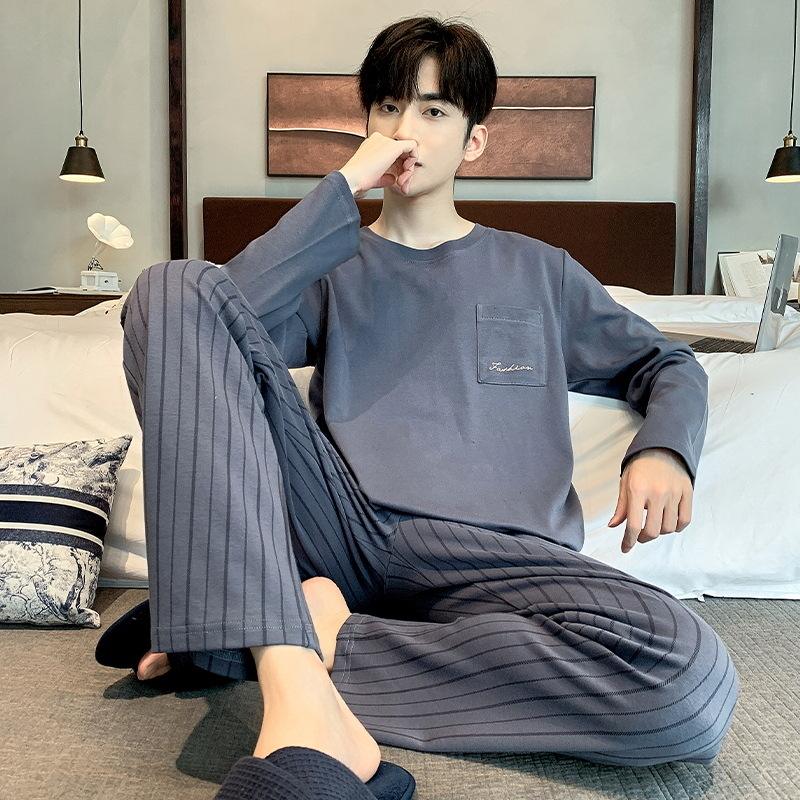 New Arrival Men's Long Sleeve Cotton Shirt and Pants Pajamas Set Simple Men Clothing Casual Wear Plus Size
