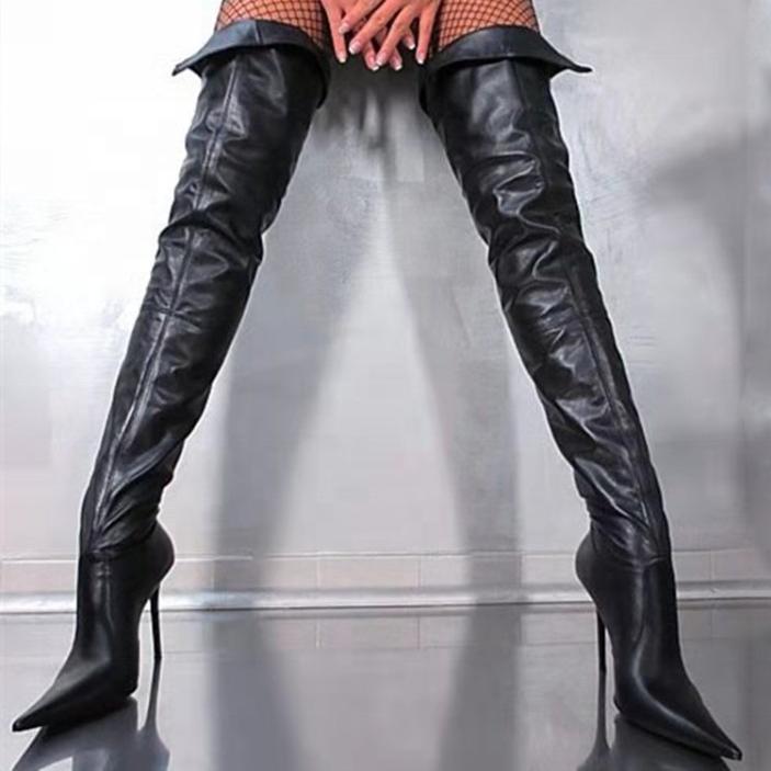 Stivali donna sopra il ginocchio in PU, tacco sottile 12 cm, punta affilata, suola gomma, fodera cotone, taglie EU 35-47, confezione 2 paia