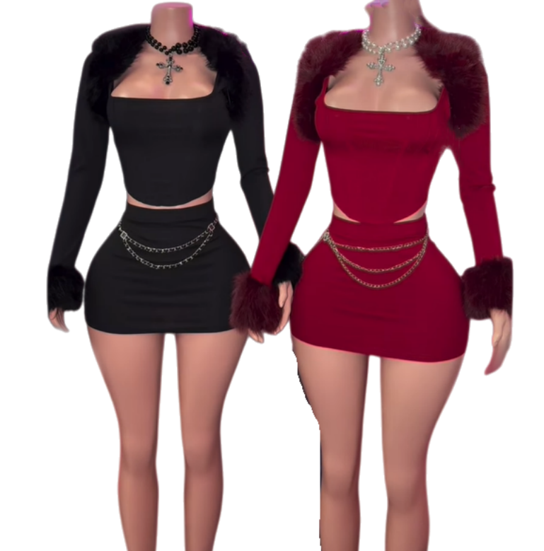 New Arrivals Women's Outfits Fur Patchwork Crop Jacket Skirt 2 Piece Set Sexy Club Skirts Two Piece Set Women Clothing 2026