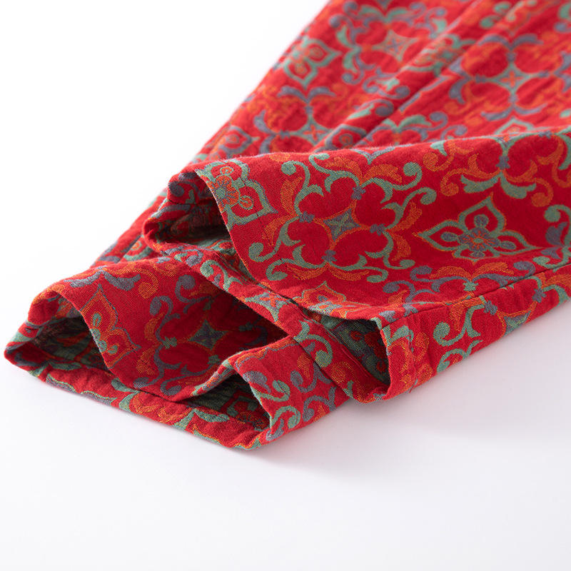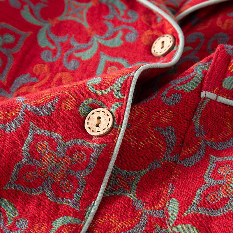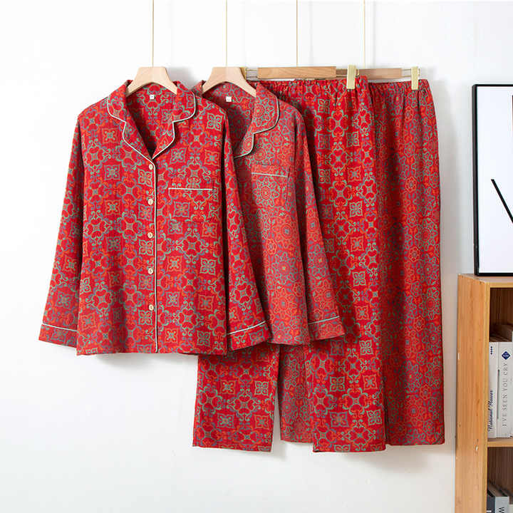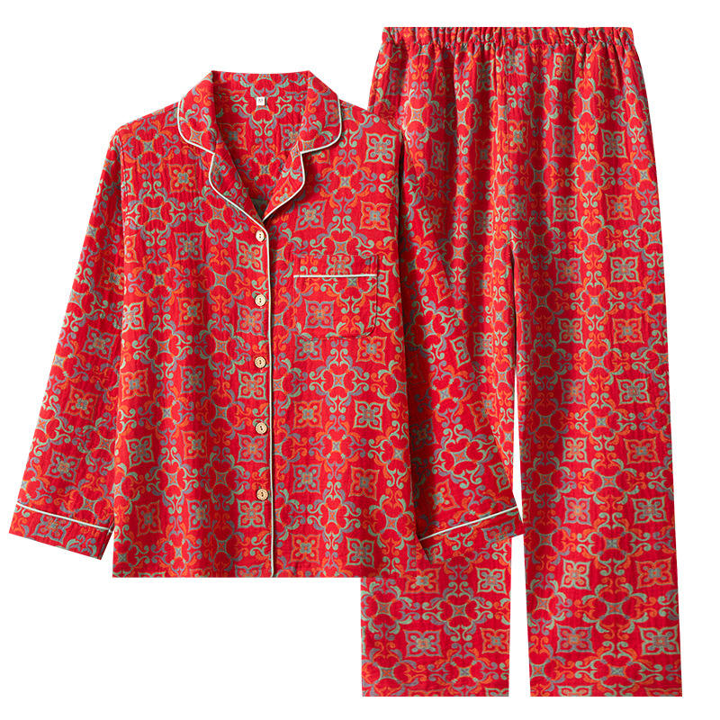 YIYAN Nuovo Pigiama Personalizzato in Puro Cotone Rosso a Doppio Strato, Set da Casa con Maniche Lunghe e Pantaloni per Donna