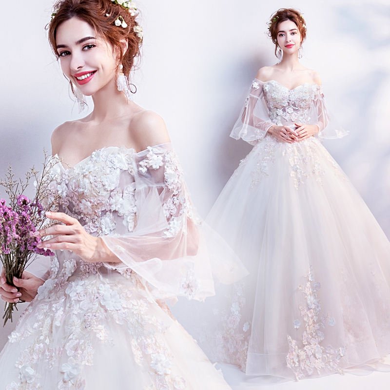New Champagne Wedding Dress Bride Married Sweetheart Lace Flower Puff Sleeves Long Wedding Gowns