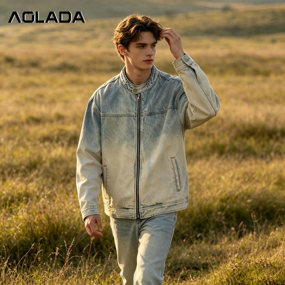 Giacca in Denim Sfumato Stile Vintage Americano Personalizzabile, Giacca Cargo alla Moda per Uomo con Design Pratico