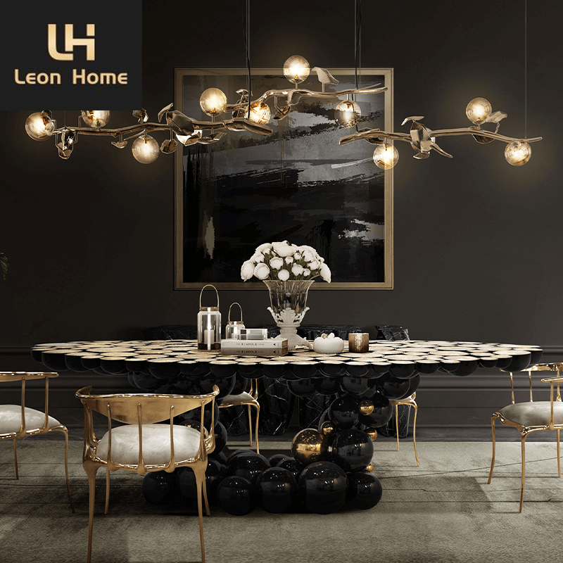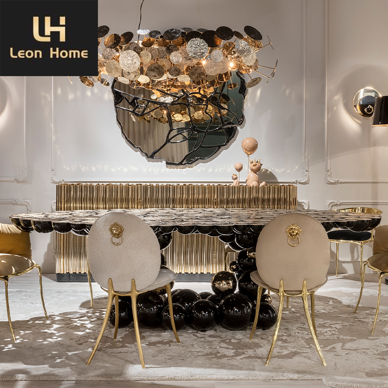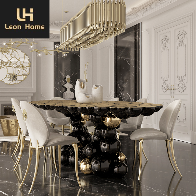 Nuovo Tavolo da Pranzo di Lusso Personalizzabile in Lacca Nera per Hotel 5 Stelle con Design a Sfera in Acciaio Inox Placcato Oro