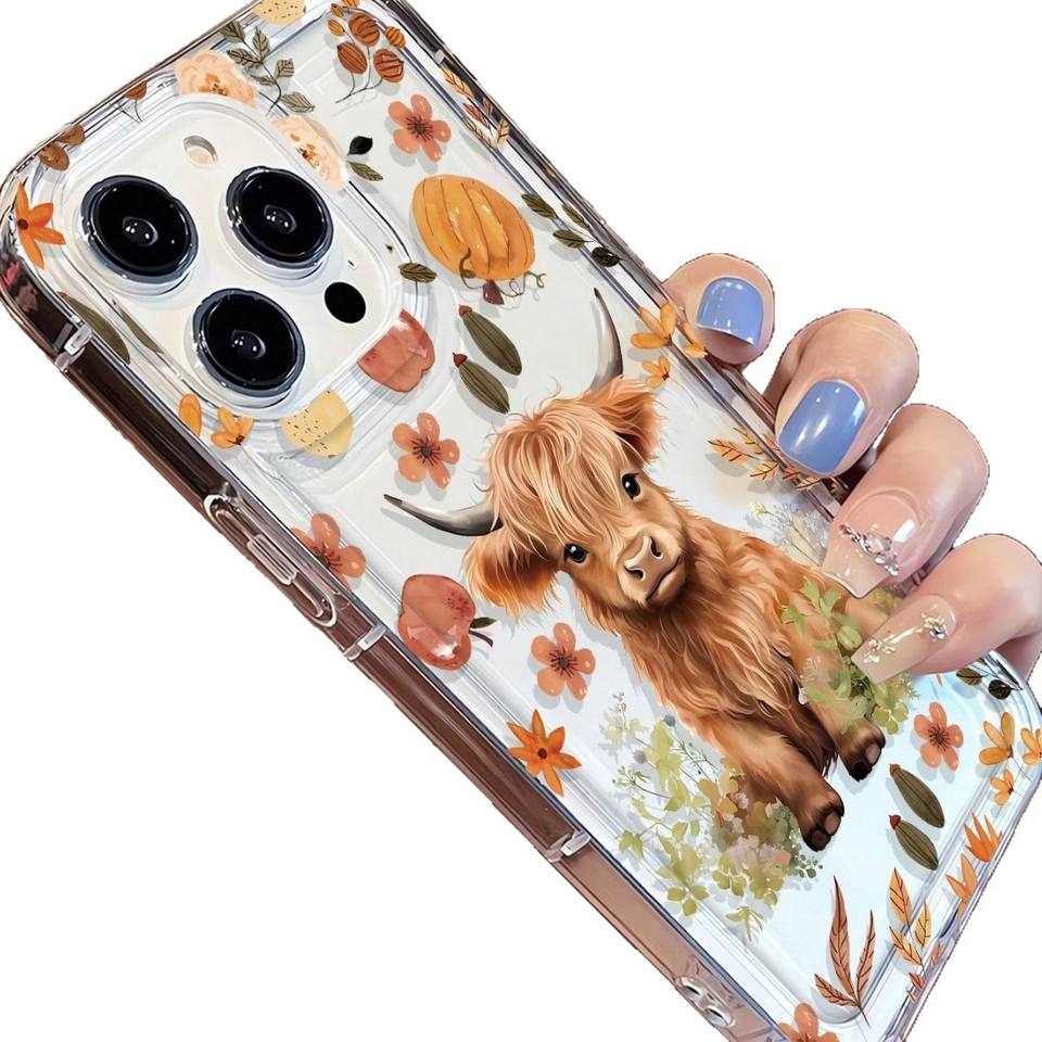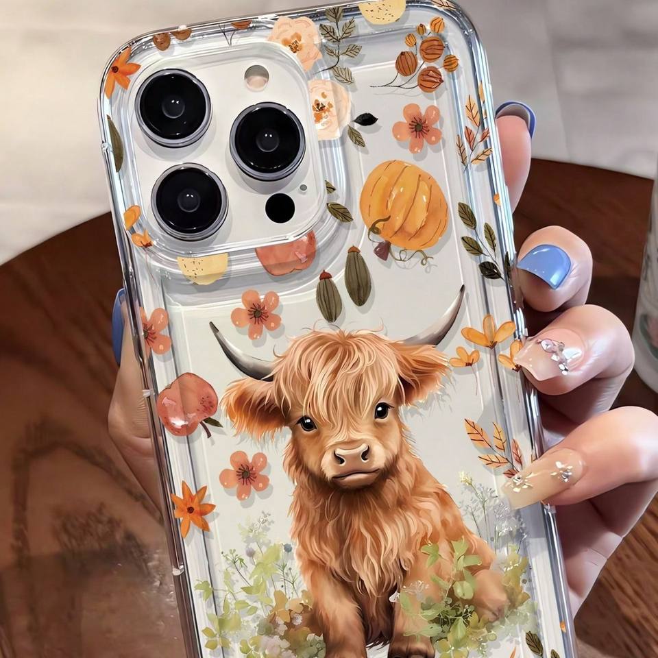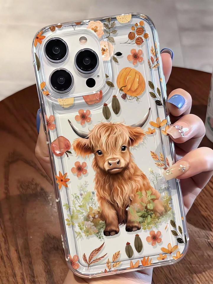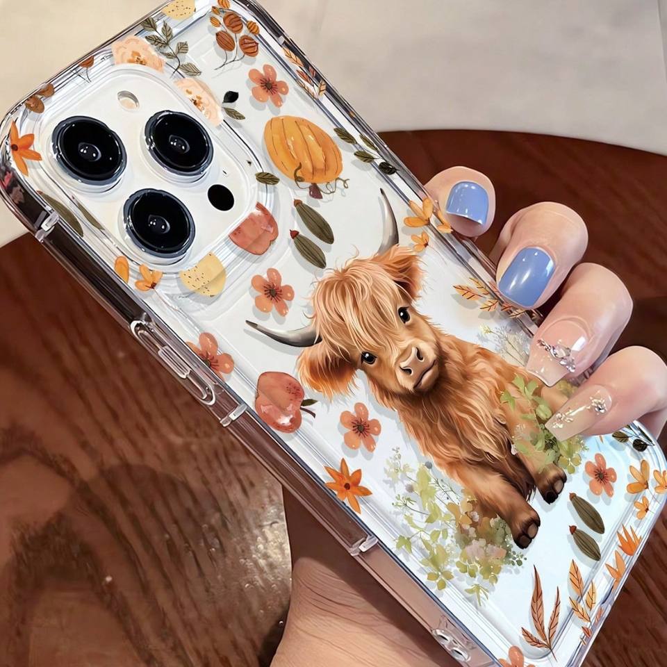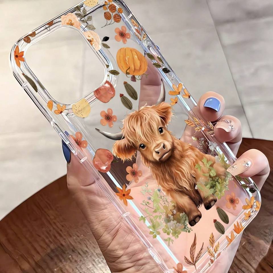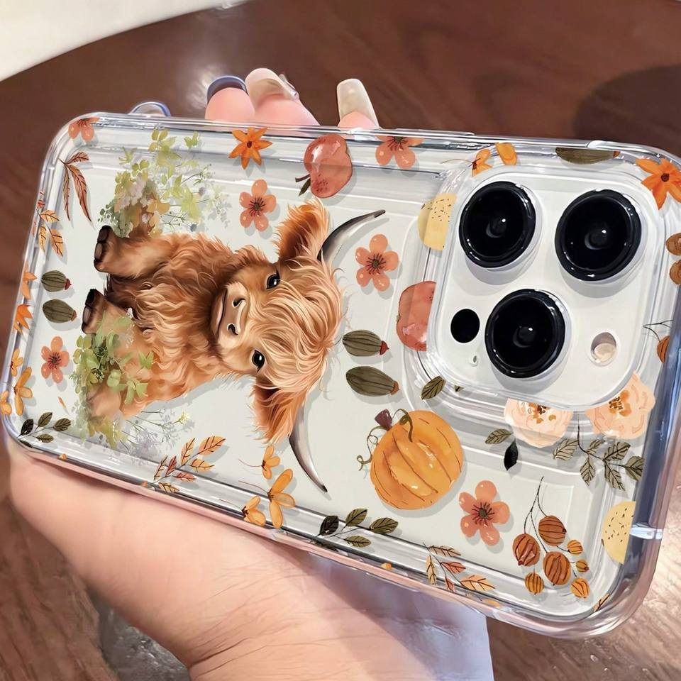 Nuova Cover Trasparente per iPhone 17 16 Pro Max con Stampa di Vitello Giallo Carino, Foglie Cadute e Fiori Autunnali, con Foro Grande