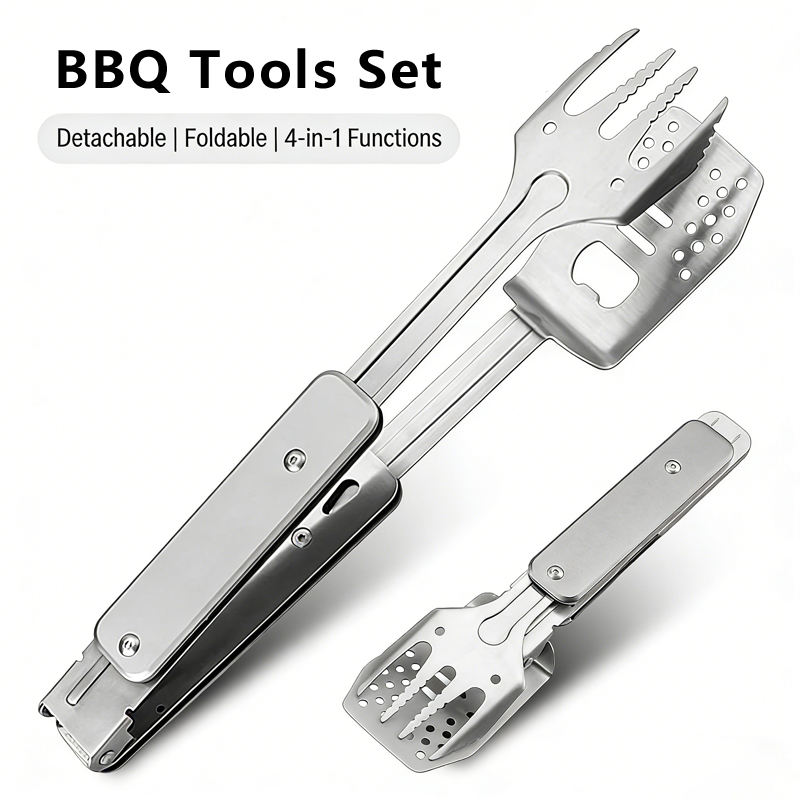 Nuovo Design Set di Utensili per Barbecue 4 in 1 Pieghevoli Multifunzione in Acciaio Inox con Spatola, Forchetta e Pinze per Campeggio all'Aperto