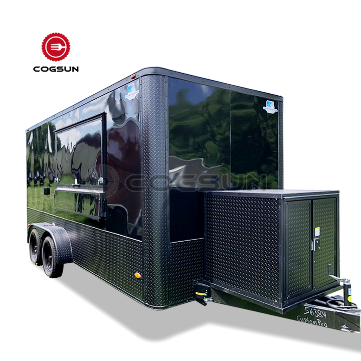 Nuovo design, rimorchio per food truck nero con cucina personalizzata, camioncini per pizza completamente attrezzati