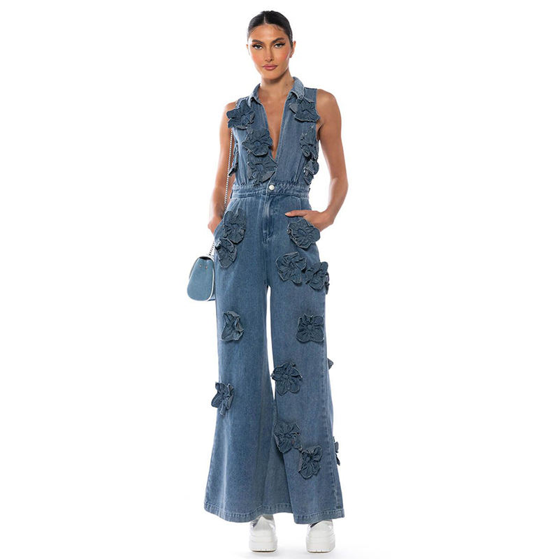 New Design Custom Sleeveless V Neck Adjustable Belt Denim Fabric Floral Denim Jumpsuit Overalls Wide Leg Pants for Ladies Women