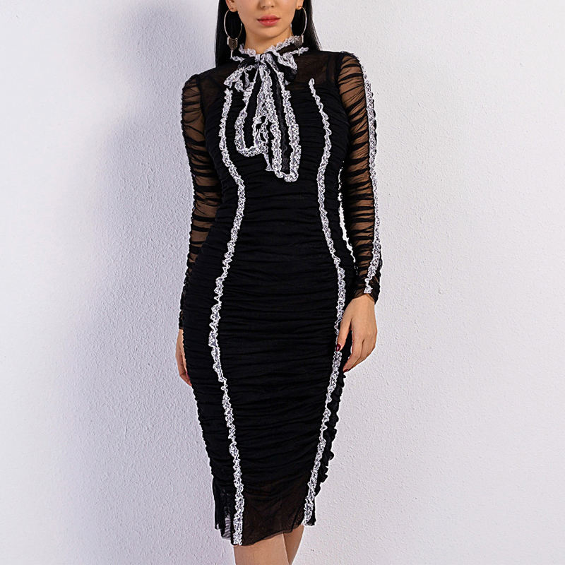 New Design Luxury One-Piece Black Long Sleeved Women'S Dress with Stacked Pleats and Bow Tie Dress