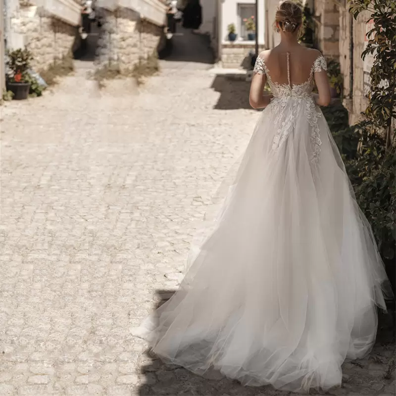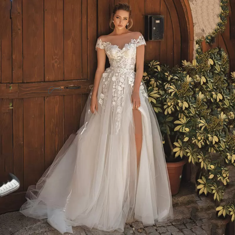 Nuovo Design Abito da Sposa Vintage con Collo Trasparente, Maniche Corte a Cappuccio, Spacco Laterale, Elegante Abito Nuziale Bohémien con Effetto Illusione