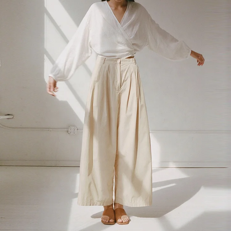 New Design Women Lightweight Cotton Linen Relaxed Zipper High Waist Loose Wide Leg Pants for Ladies Casual Pleated Trousers