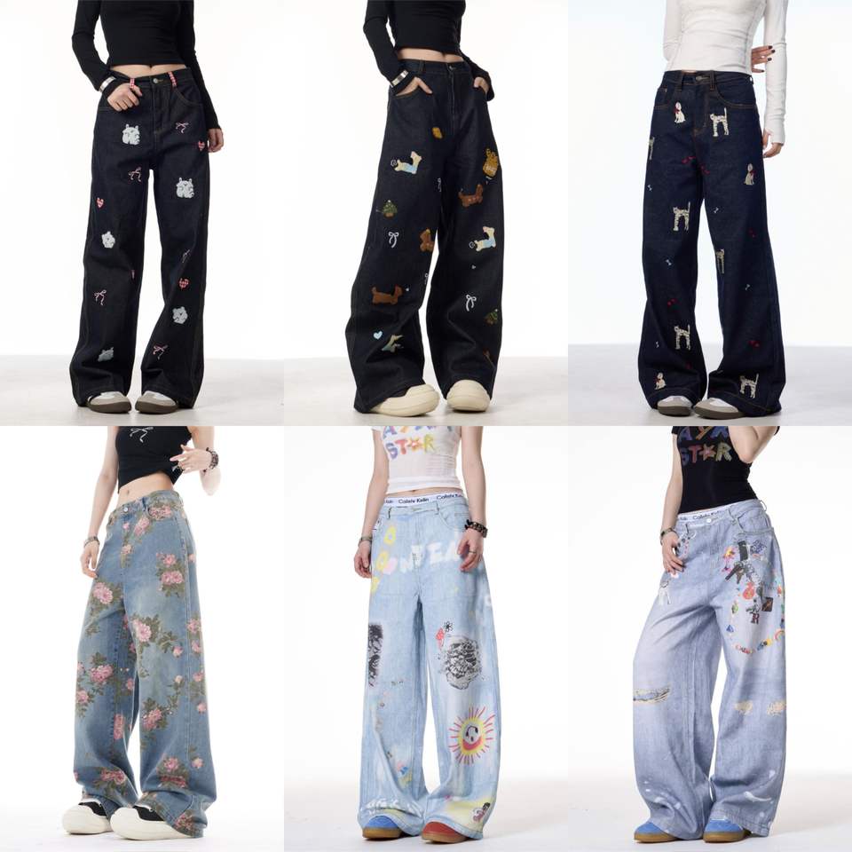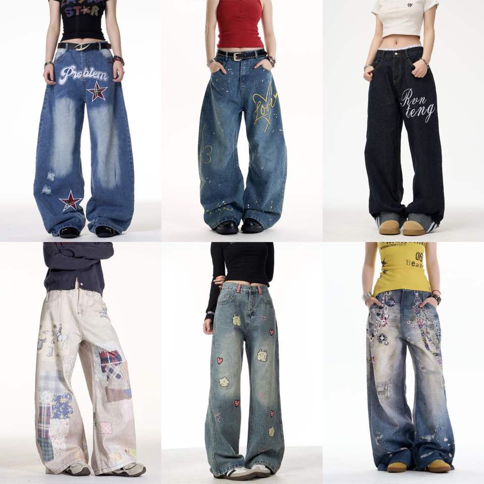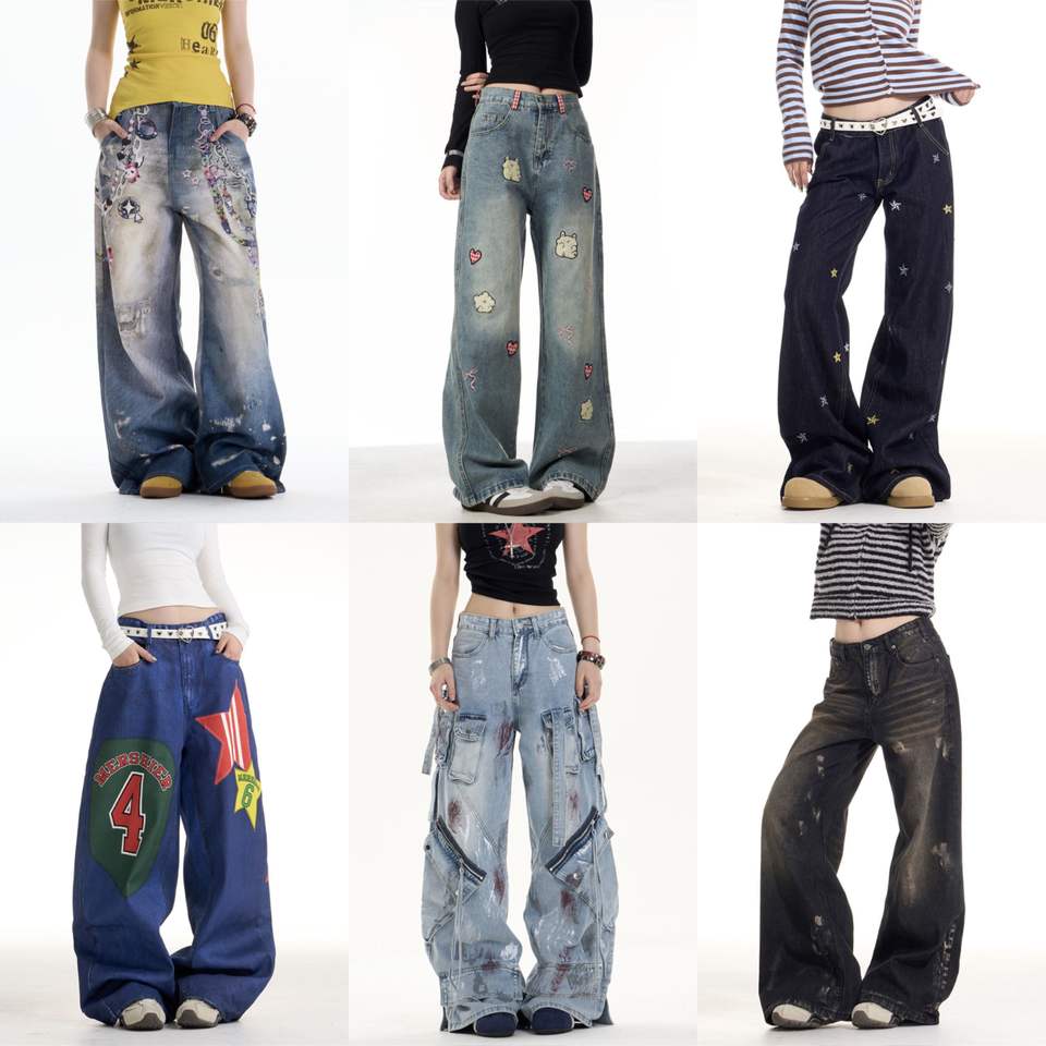 New Elastic Button Mid Waist Wide Leg Printed Women's Tear Baggy Jeans Ladies Breathable Street Casual Pants Work Trousers