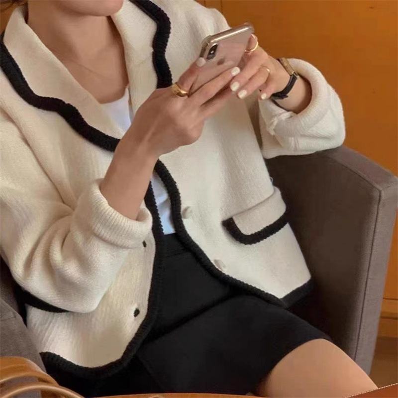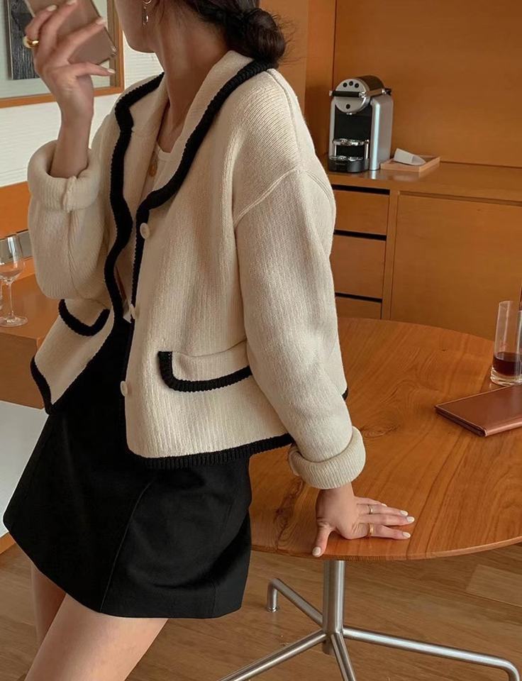 New Fashion Gentle Retro Black and White Knitwear Long Sleeve Women's Sweater Button Doll Collar Cardigan