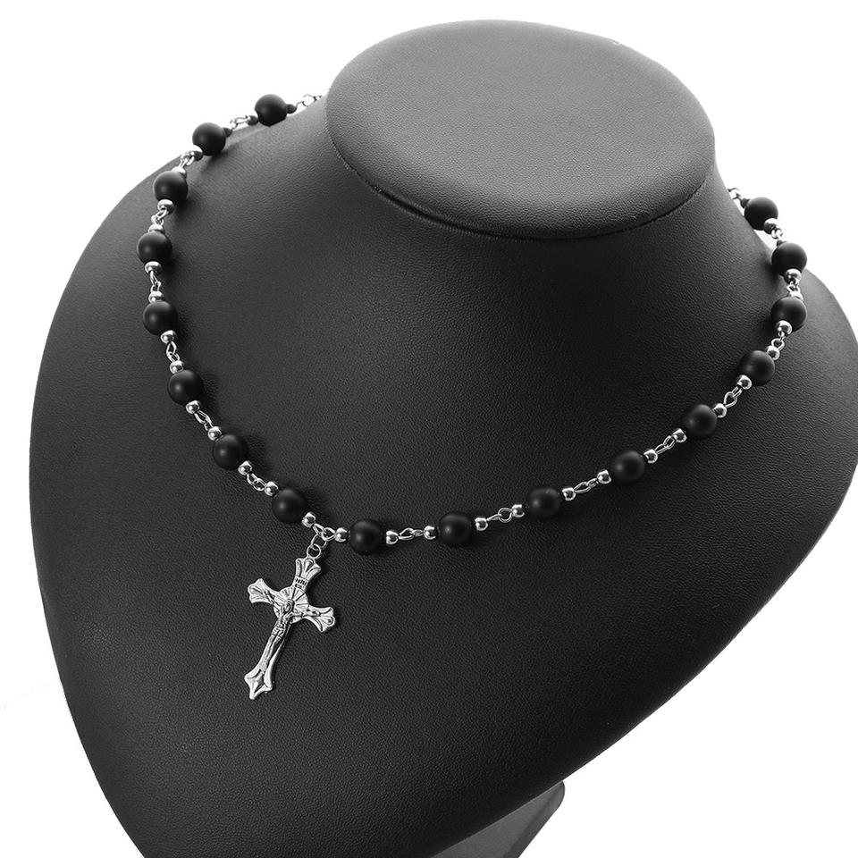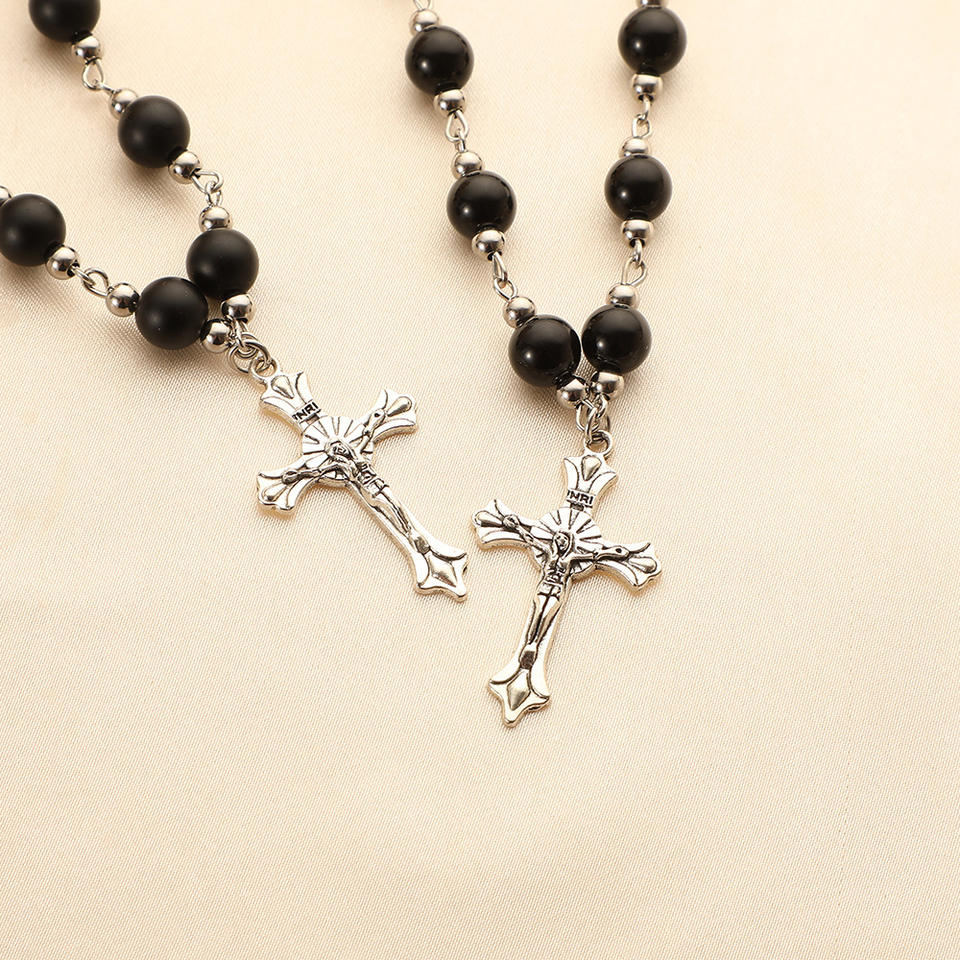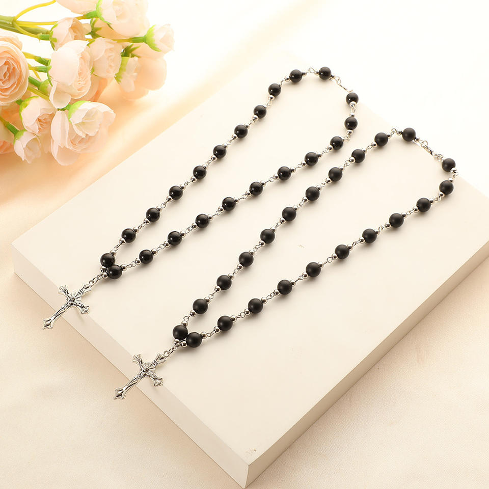 New Fashion Jewelry Metal Cross Pendant Prayer Necklace 8mm Glass Stone Black Onyx Rosary Beaded Necklace for Men Women