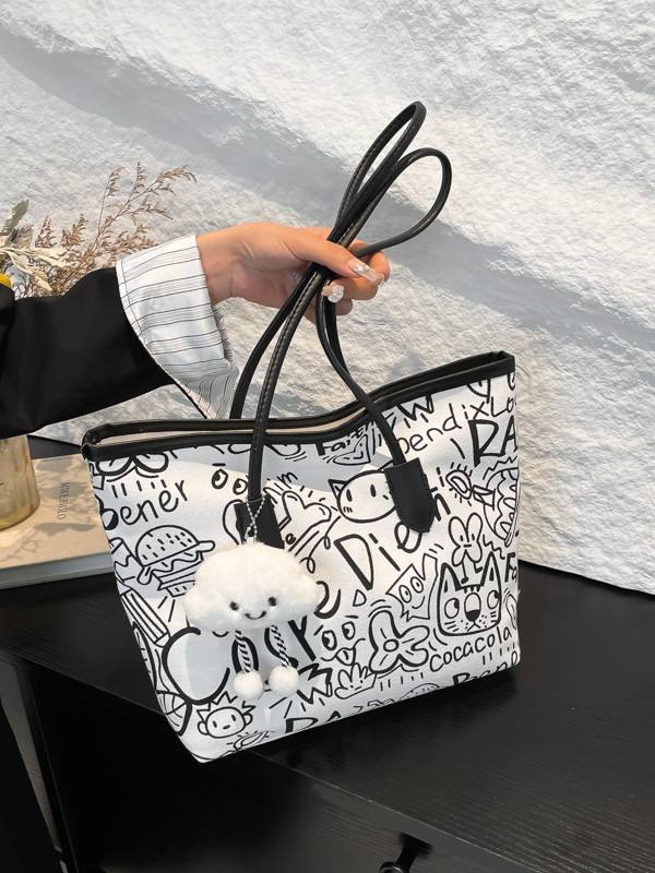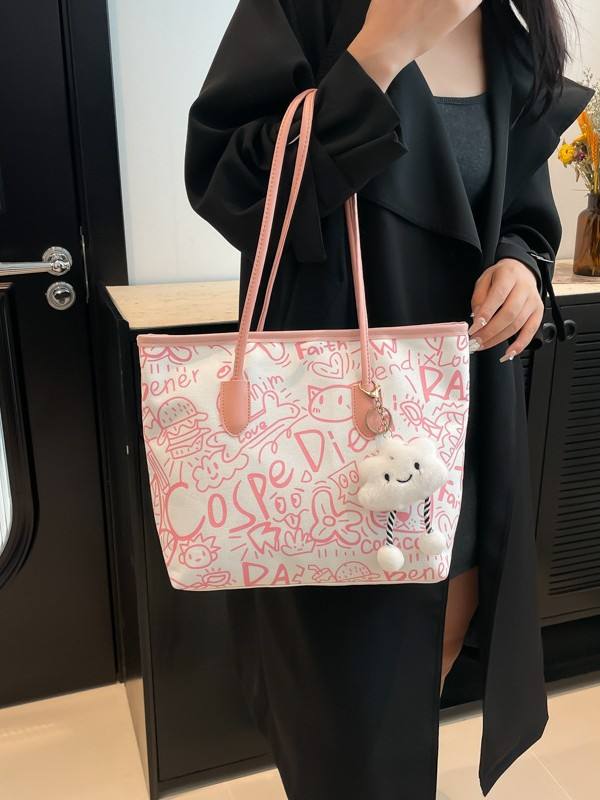 New Fashion Women's Graffiti Canvas Tote Bag Large Capacity Shopping Bag for Women With Lovely Cloud Pendant Sac