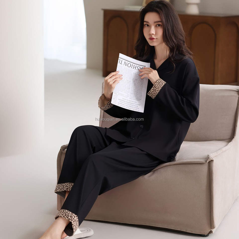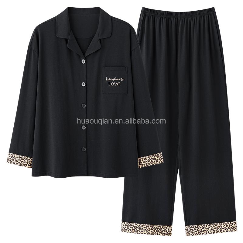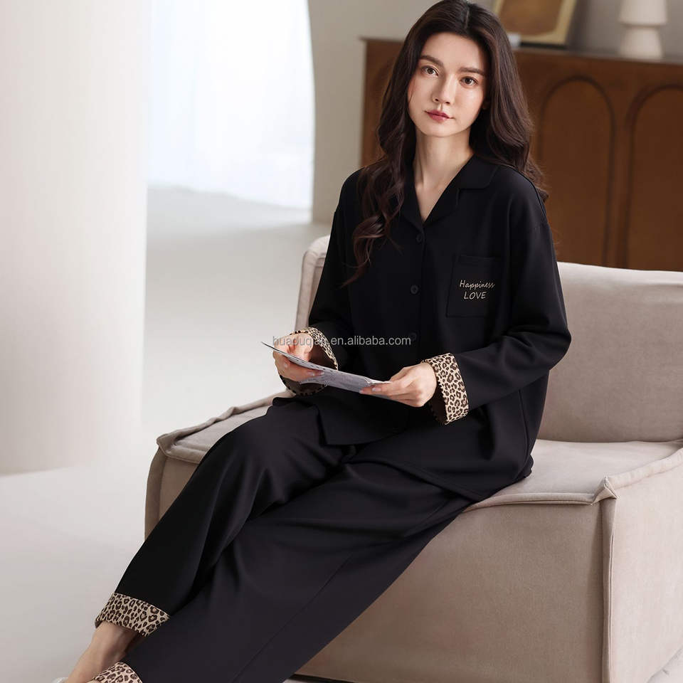Nuovo Pigiama con Stampa Leopardata sul Bordo, Nero, Semplice e Comodo, in Puro Cotone, Abbigliamento da Notte Casual per Donne