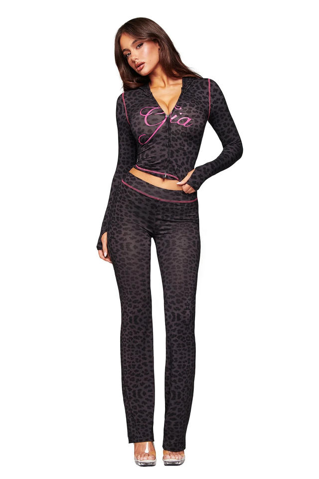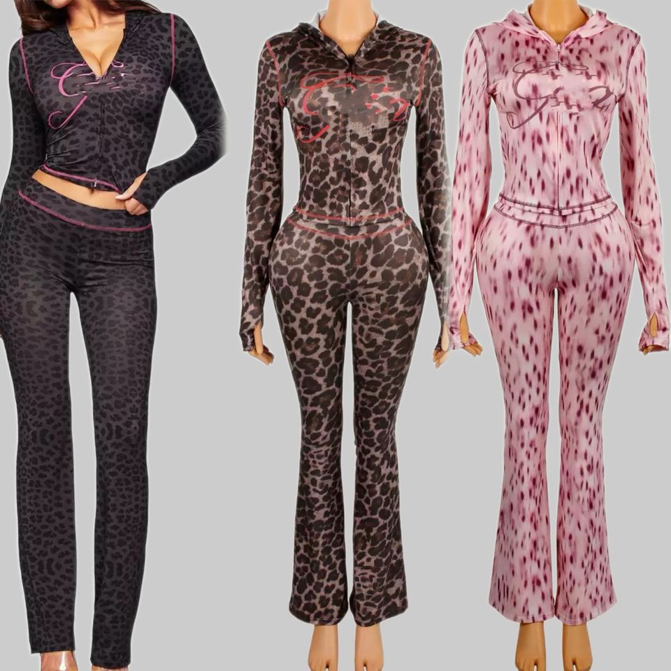 Nuovo Set di Moda INS Due Pezzi, Completo Casual con Stampa Leopardata, Felpa con Cappuccio e Zip a Maniche Lunghe e Pantaloni, Outfit da Donna
