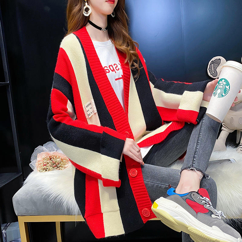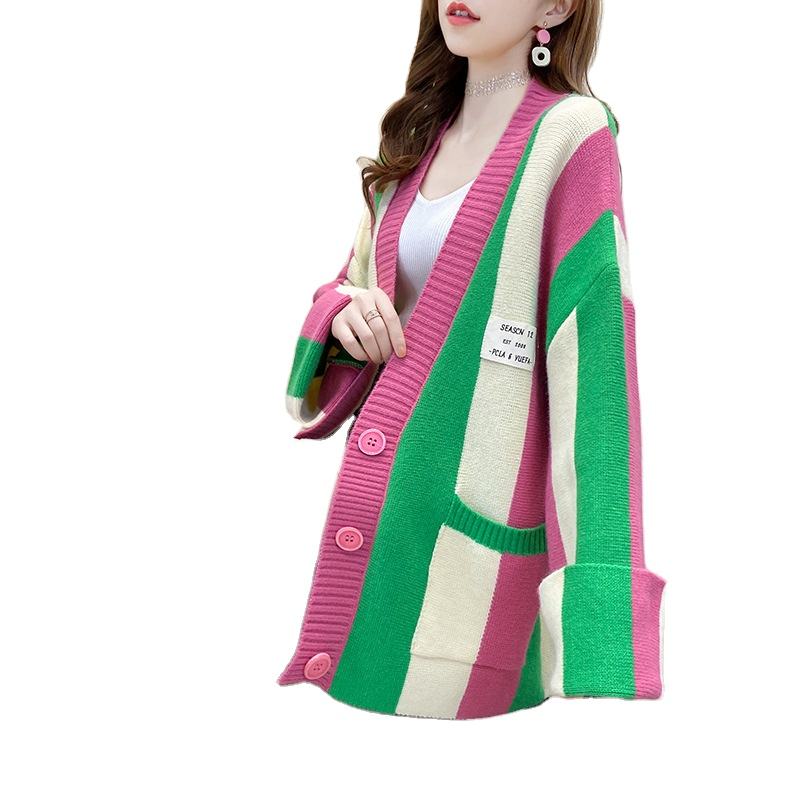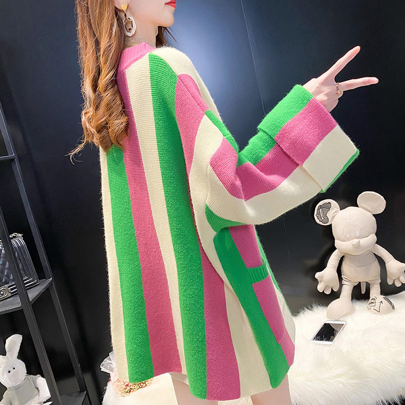 New Korean Long Sleeve High Quality Women Autumn Winter Striped Knitted Coat Red White Pink Green Sweater