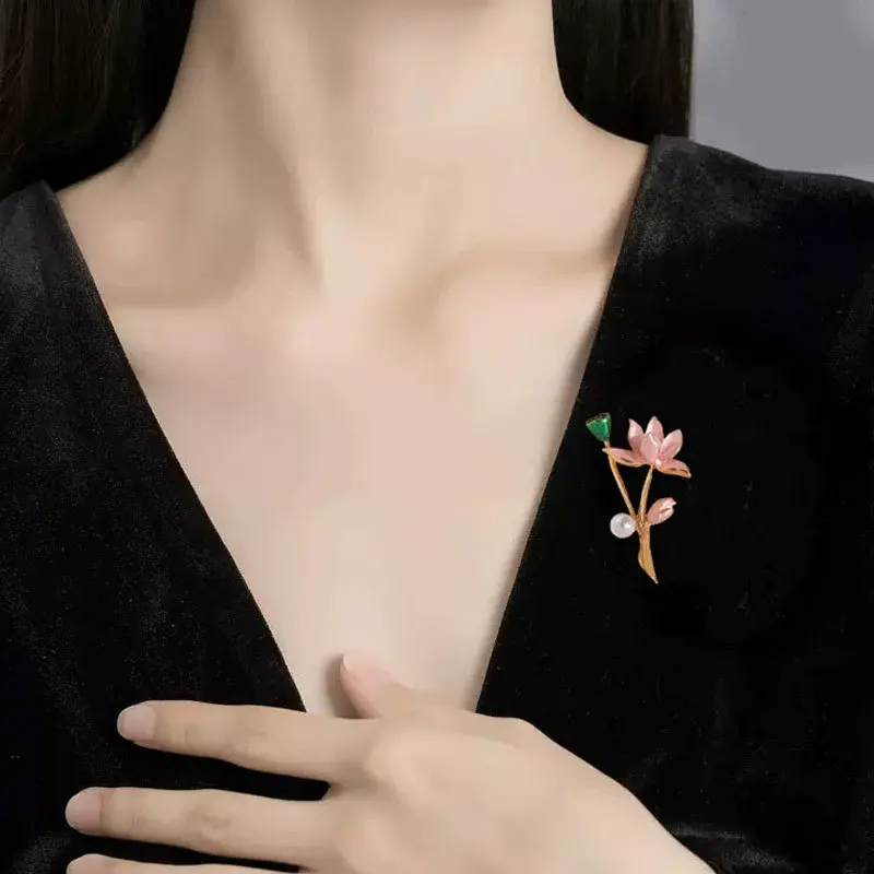 New Light Luxury Gold Plated Alloy Imitation Pearl Lotus Brooch for Women & Children's Wedding Party Gift