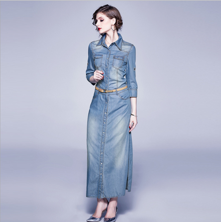 New Model Fashion Long Sleeve Stripe Denim Woman Long Dress