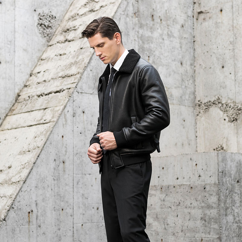New Retail Wholesale Fashion Men's Slim Fit Jacket Black Fake Leather Teddy Fur Collar Buckle Loop Warm Male Jacket
