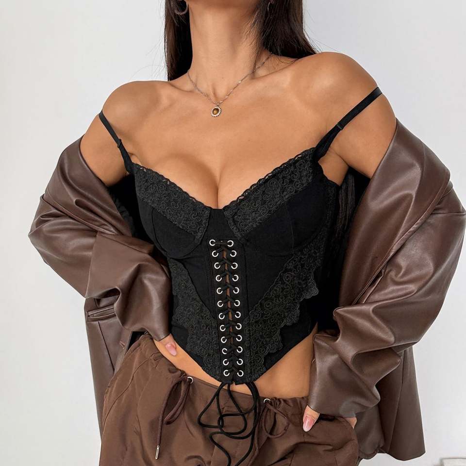 Nuovo Bustier in Pizzo Tinta Unita con Ferretto, Top Corto Sexy Regolabile con Stecche per Donna