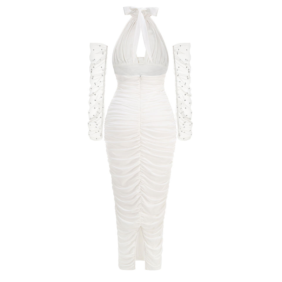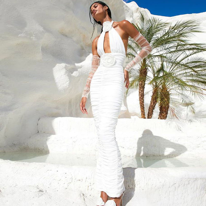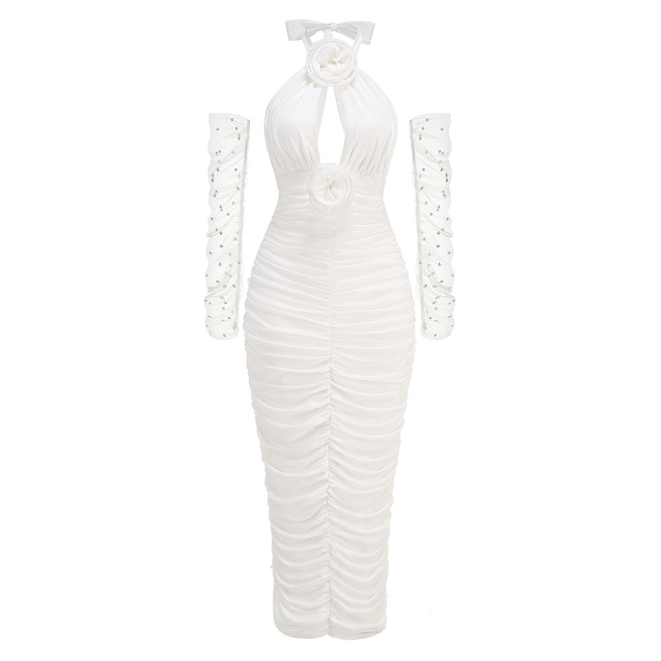 Nuovo Abito Lungo da Festa con Collo a Rete, Decorazione Floreale Sexy, Design Semplice e Aderente, con Guanti e Perline a Bolle
