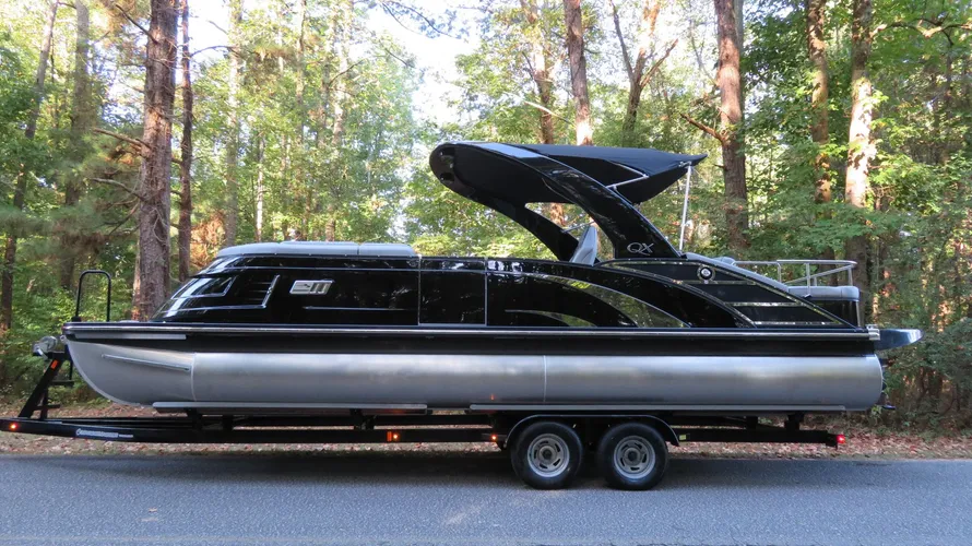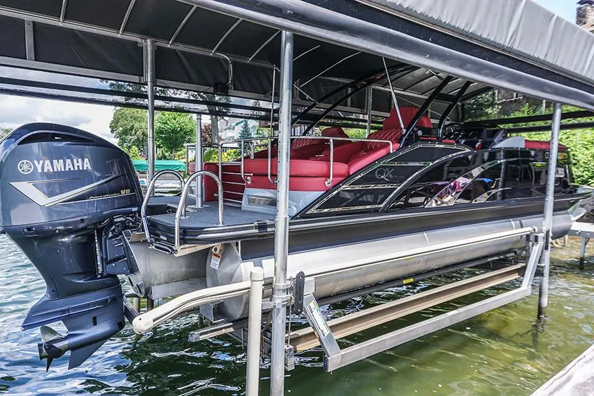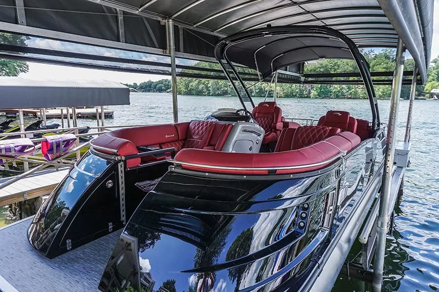 New Sporty Modern Design Fiberglass Black and Red Tritoon Boat with PVC Flopr and Arch Double Color Fence Pontoons