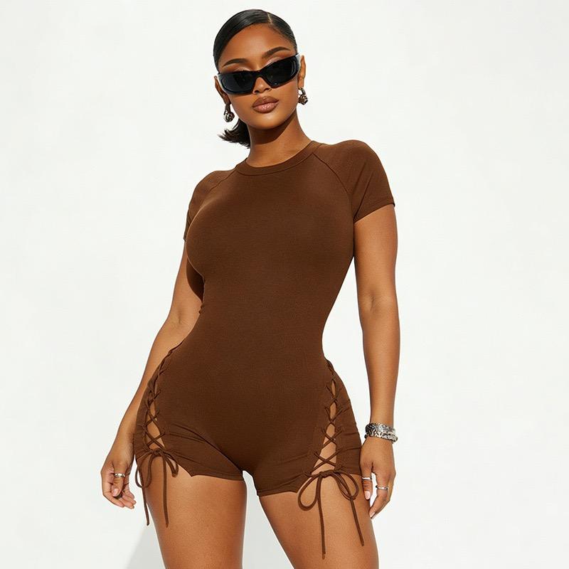 Nuova Tuta Corta Estiva Elasticizzata con Lacci e Maniche Corte, Body Intero Nero per Donna
