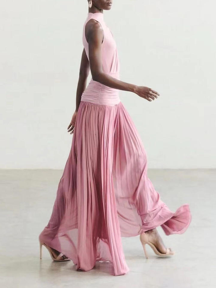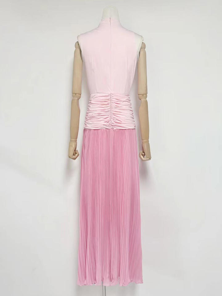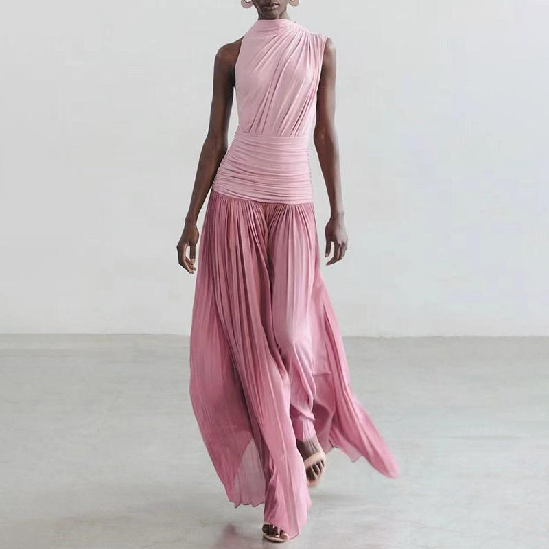 New Stock Arrival Women's Pink One-Shoulder High-Neck Pleated Long Dress for Daily