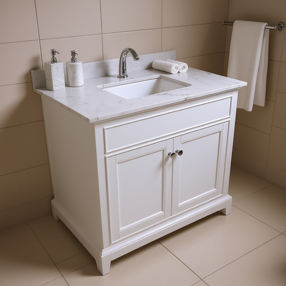Top per Mobile Bagno 37 Pollici in Pietra Bianca Carrara, Lavabo Rettangolare Sottopiano in Ceramica, Foro Singolo per Rubinetto, Design Elegante