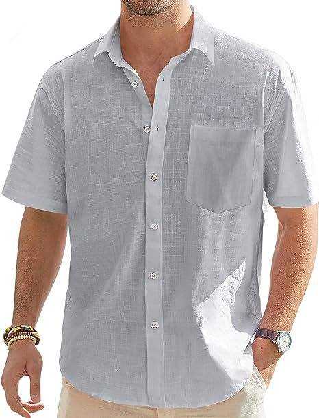Nuova Camicia da Uomo in Cotone e Lino a Maniche Corte, Tinta Unita, Casual con Bottoni, Stile da Spiaggia, Personalizzabile