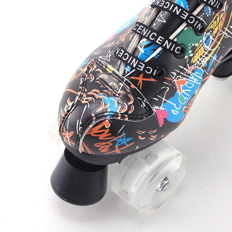 Nuovi Pattini in Linea Classici a Quattro Ruote con Tacco Alto in Pelle PU Lucida Stampata Artistica Effetto Tendine di Manzo in Microfibra