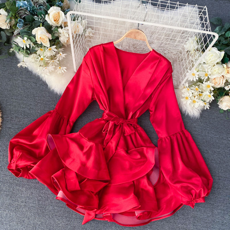 New Style Spring Women French Vintage Dress Ladies Elegant Party Robe Spring V Neck Lantern Sleeve Slim Ruffles Holiday Dresses
