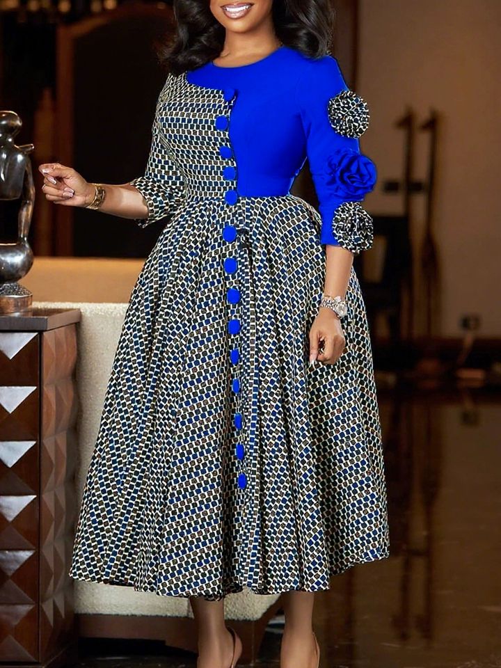 New Style Women's Clothing From Abroad - Elegant Round-neck, Three-quarter Sleeve, Printed, Patchwork Dress