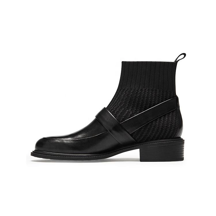 New Style Women's Knit Leather Ankle Boots with Buckle Decoration Black Leather Ankle Boots