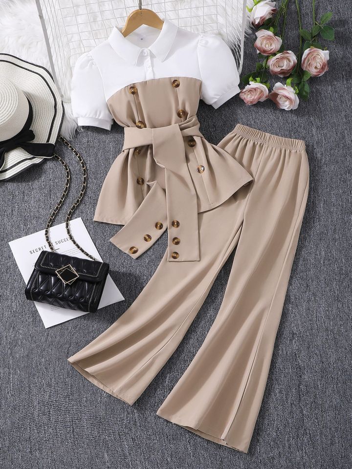 New Style teen Girls short Sleeves patchwork shirt top + casual solid Pants 2 Pieces Outfit Clothing Set