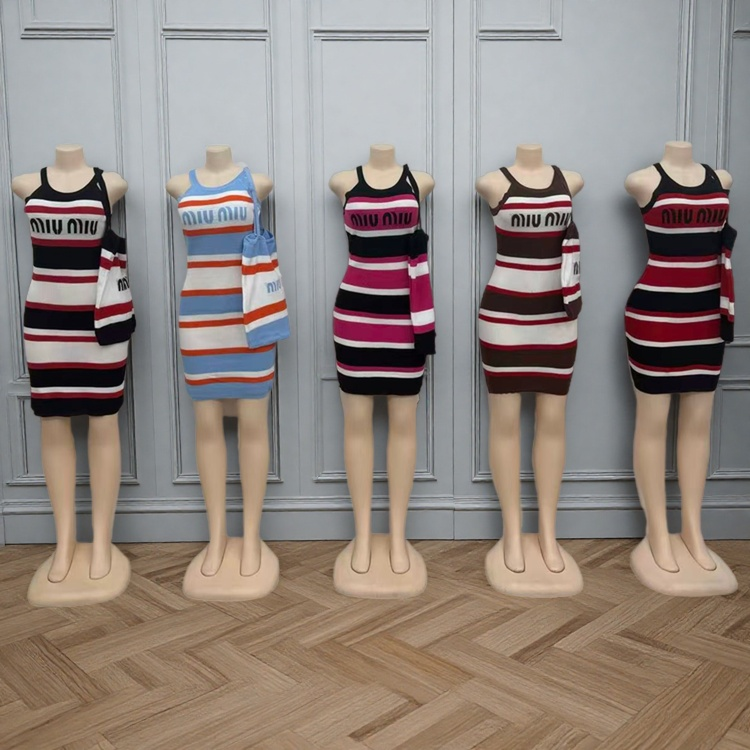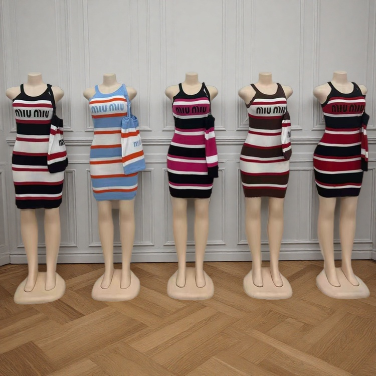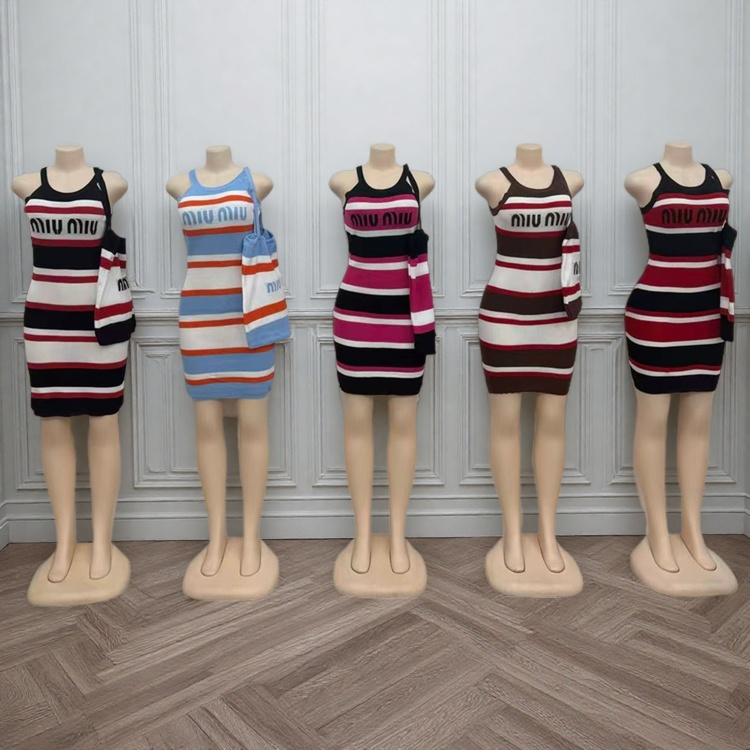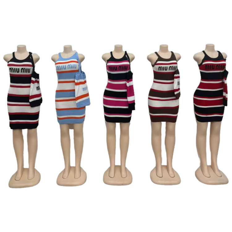 New Summer Fashion Women Shoulder Bag Stitching Color Matching Striped Sleeveless Sheath Dress