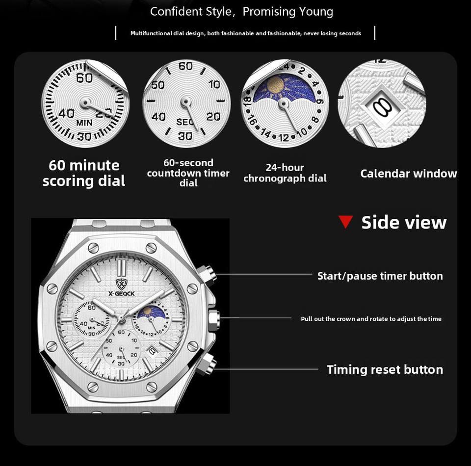 Nuovo Orologio Meccanico Automatico da Uomo con Tre Quadranti, Sei Lancette e Fasi Lunari, Cinturino in Acciaio Inossidabile, Orologi di Lusso per la Moda Maschile
