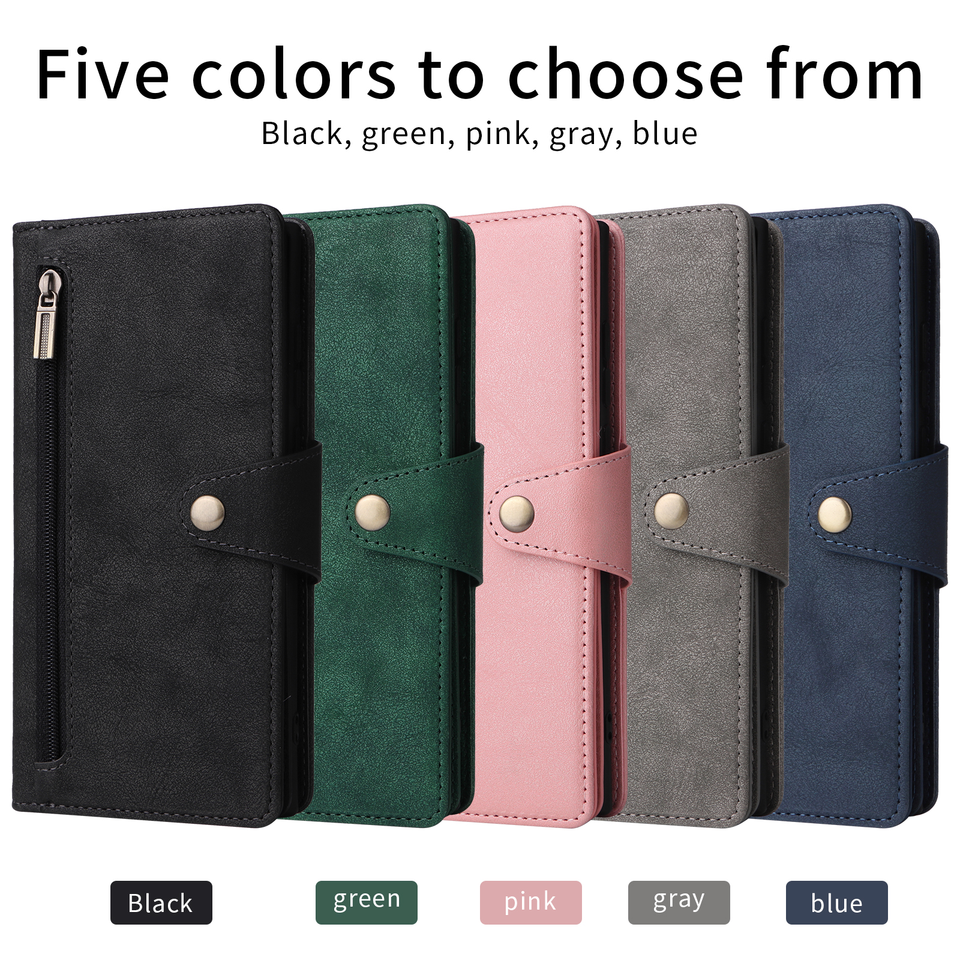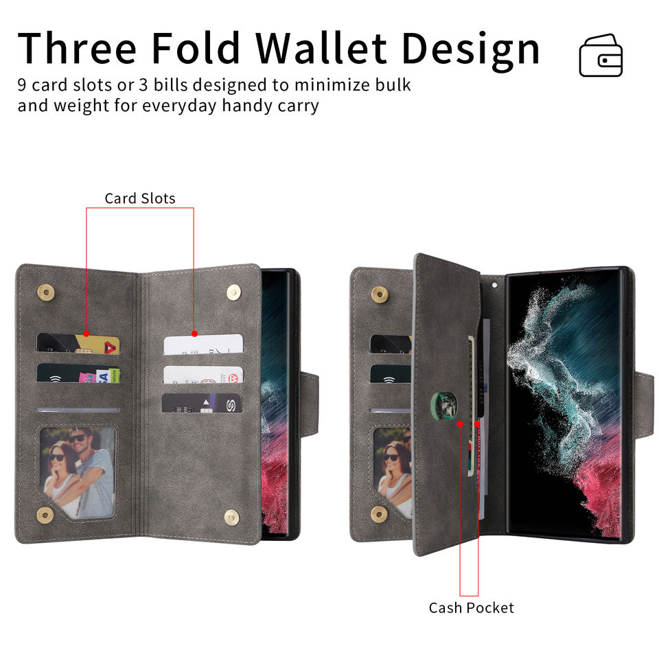 Nuovo Design Portafoglio a Tre Pieghe con 9 Slot per Carte e Cerniera in Pelle PU per Custodia Telefono Samsung S21 S22 S23 Ultra Plus Pro