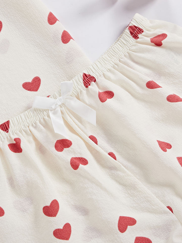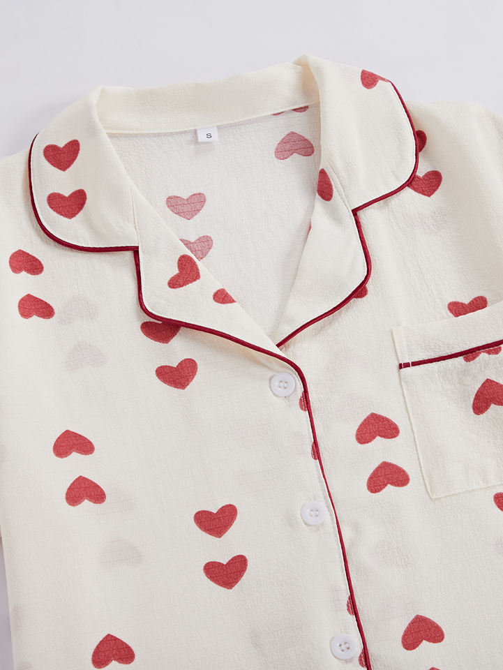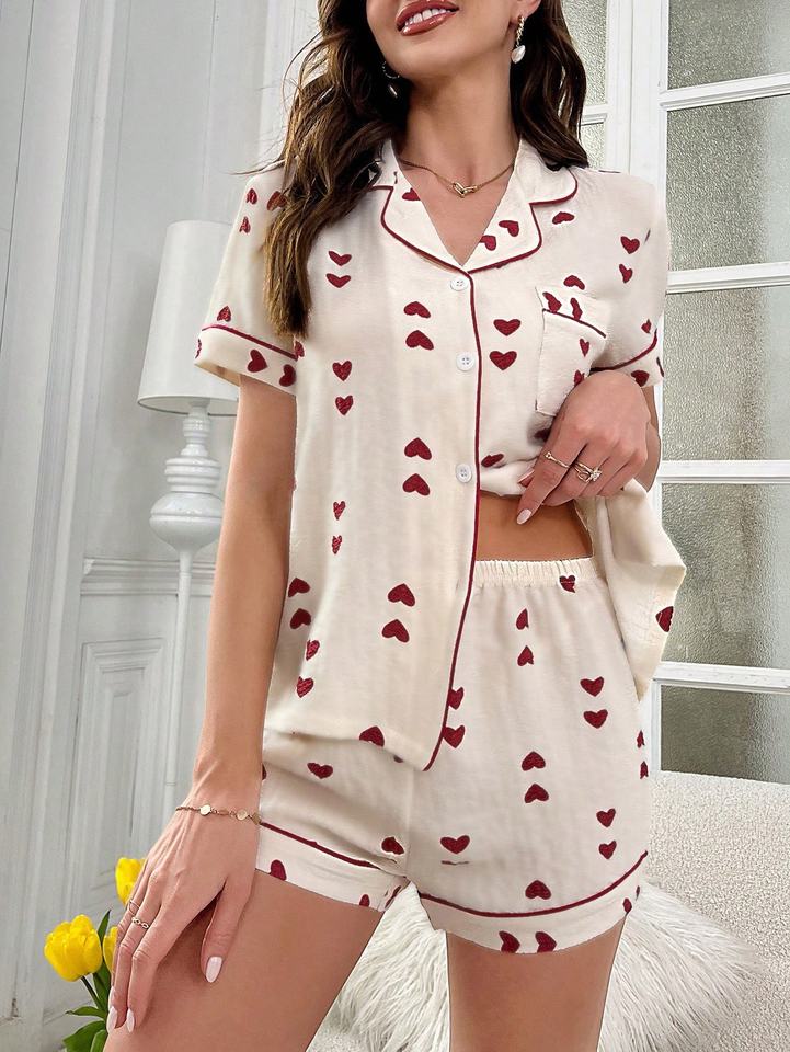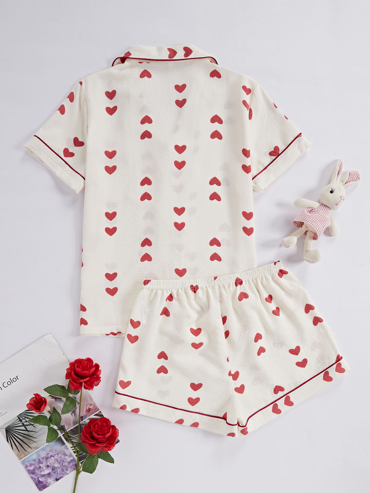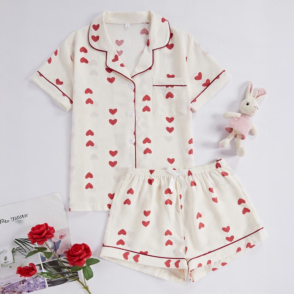 Nuovo Set Pigiama con Motivo a Cuori Bianchi, Carino e Morbido con Elastico in Vita, Pigiama Estivo da Donna