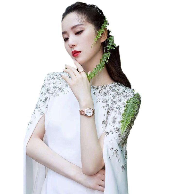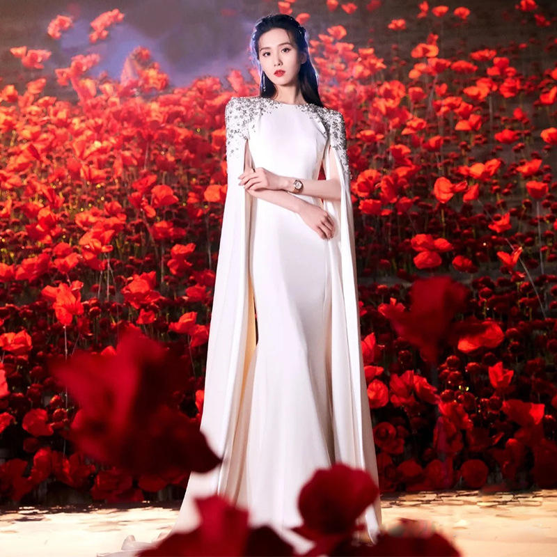 New White Mermaid Satin Evening Party Dresses Cape Sleeves Beaded Elegant Theater Opera Gowns for Women